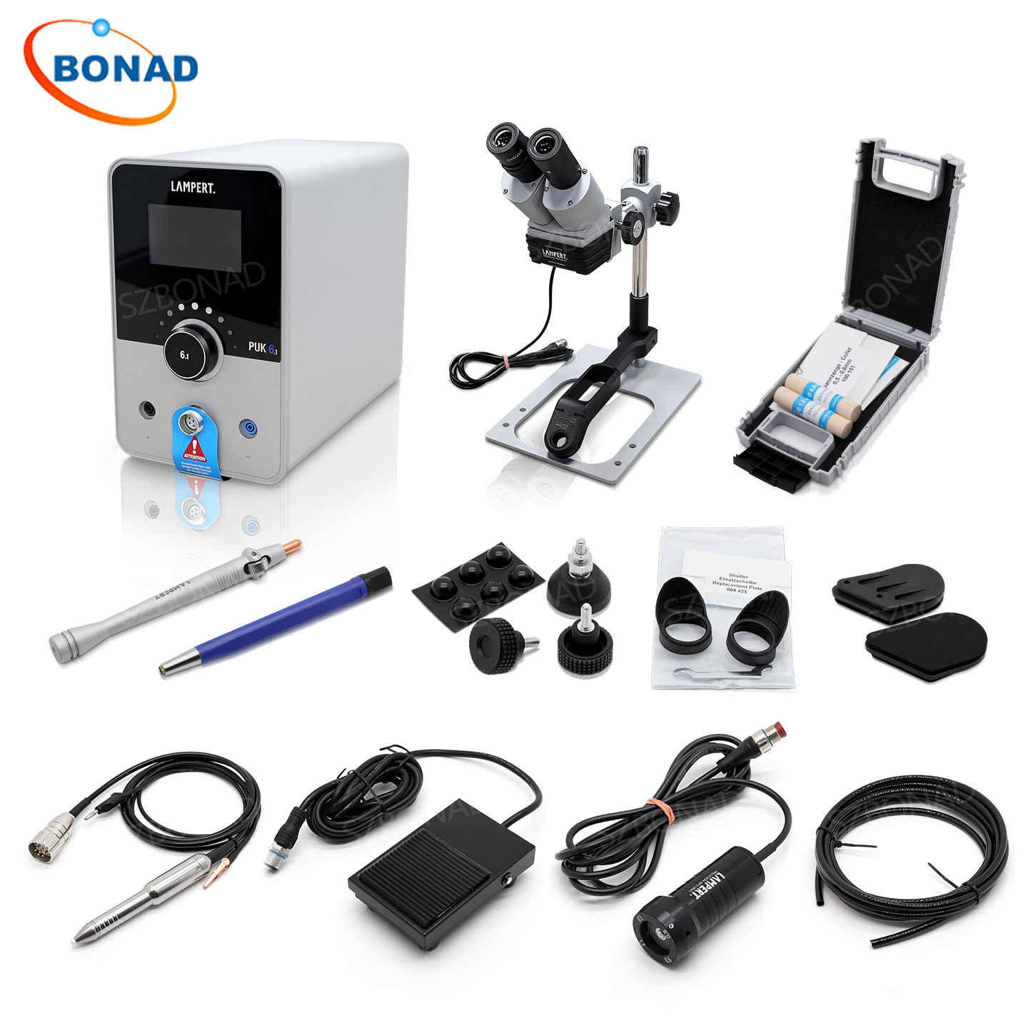 該設備包括焊筆、3 米氣管、電源線、接觸夾、金剛石砂輪、4 個直徑 0.8 毫米的 WLa 電極、2 個直徑 1.0 毫米的 WLa 電極和卡盤。