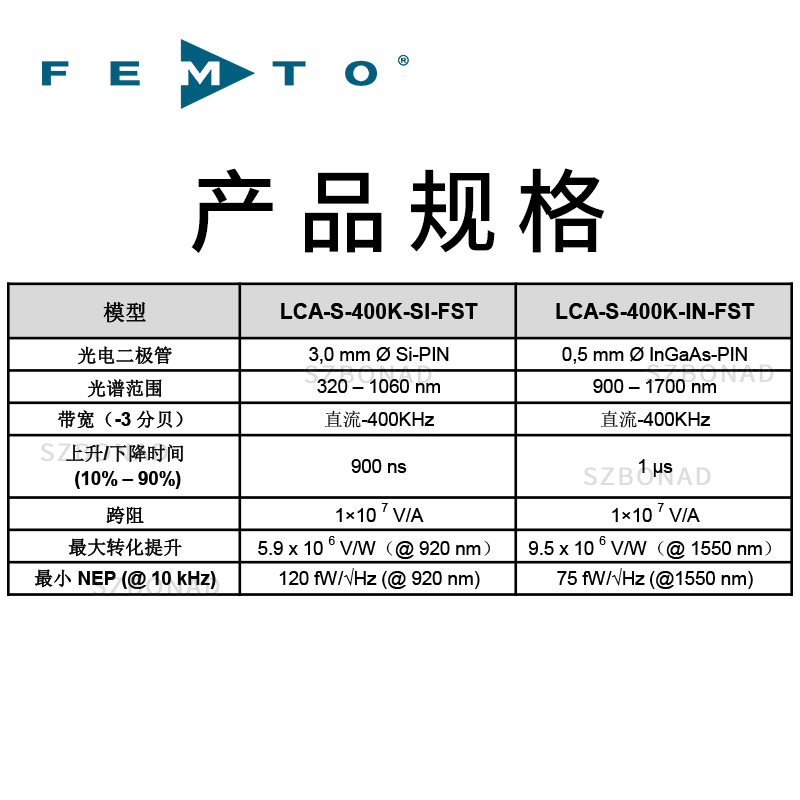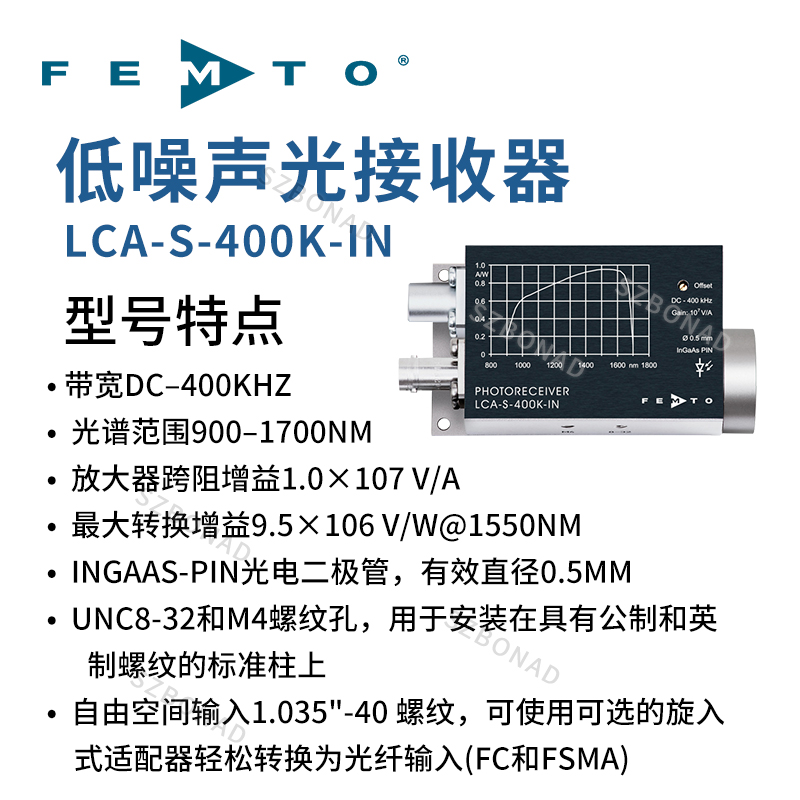 我們設計一款具有卓越性能的新的光接收器,通過用最新水平的二極管和接觸的REMTO LCT電流放大器技術的結合。LCA-S-400K 可供使用于大面積的硅或者銦鎵砷光電二極管,分別覆蓋從400到1100nm和900到1700nm的頻譜范圍。這個放大器的互阻抗是107V/A,使銦鎵砷型號的變頻增益在1550nm達最大9.5×106V/W。低噪聲跨阻放大器的最低噪聲等效功率低至 75 fW/√Hz,允許在 nanoWatt 范圍內對光信號的檢測,不用進一步求均值。