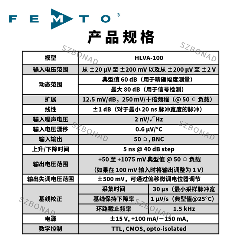FEMTO HLVA-100提供了一個達80dB的寬動態范圍。在直流耦合輸入和只有5ns的上升時間的基礎上,HLVA-100是測量快速和高動態脈沖的理想工具。它的輸入電壓噪聲非常低,只有2 nV/√Hz。這個對數增益曲線具對小輸入信號和有高的增益量,對高輸入信號具有相應低的增益量。因此HLVA-100 是高動態范圍和人們所期望的信號壓縮應用的理想放大器。